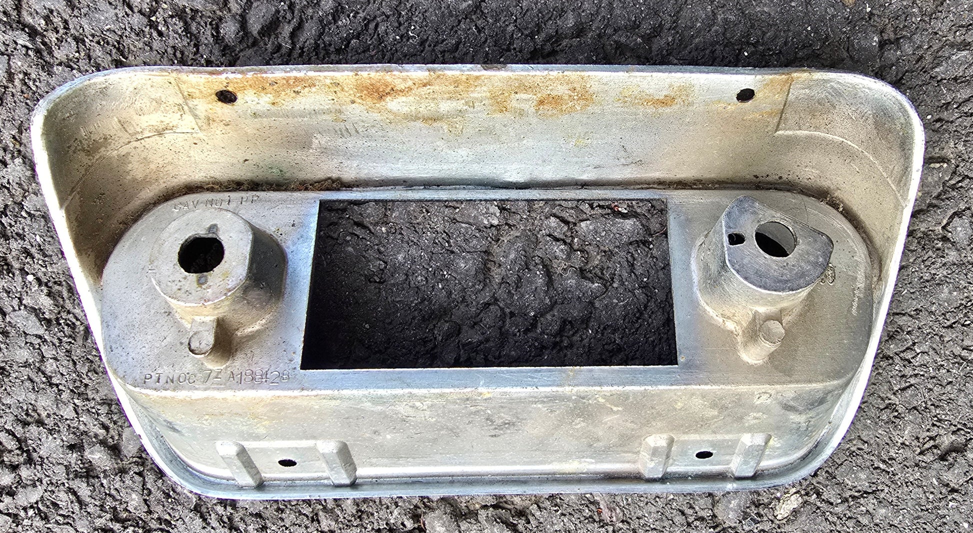 The product is a vintage 1967/68 Ford Mustang radio bezel, featuring a chrome and black design. This OE/OEM part, manufactured by Ford in the United States, is a genuine replacement piece with the part number C8ZZ-18842-A. This unique and authentic interior accessory is a perfect fit for classic Ford Mustangs from the late 1960s, adding a touch of nostalgia and authenticity to the vehicle's interior.