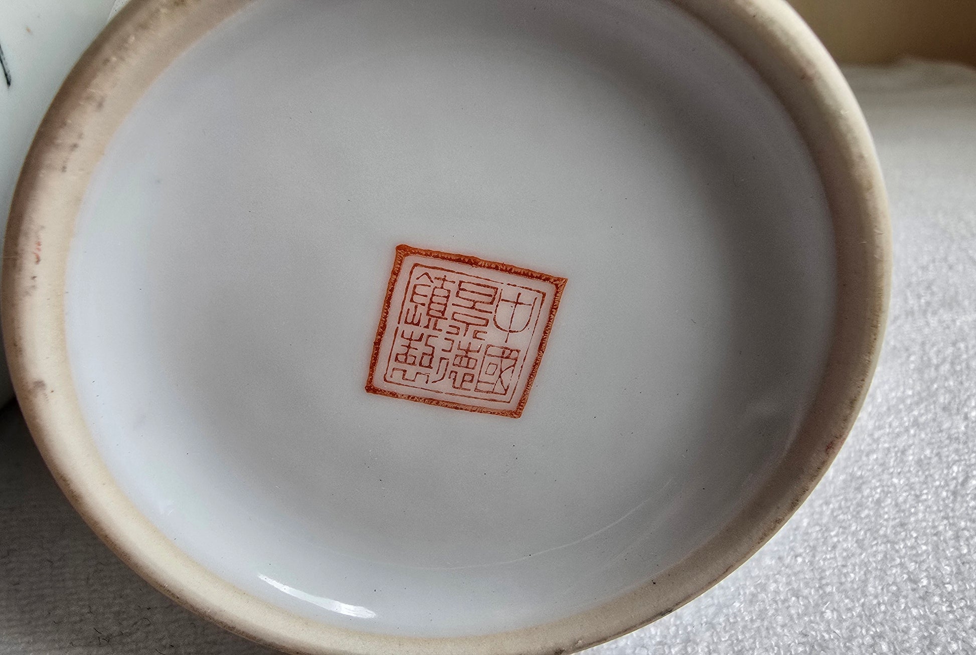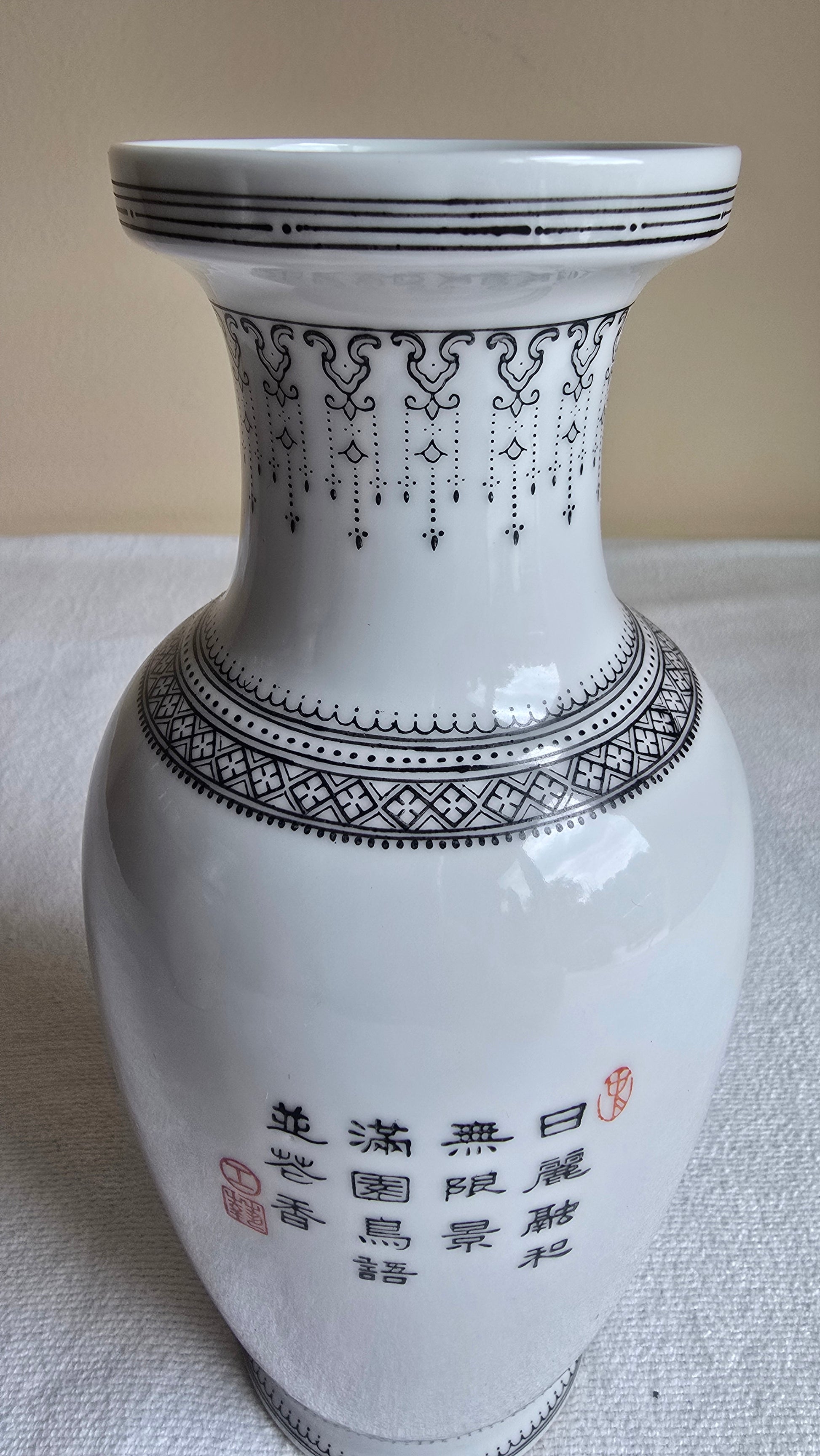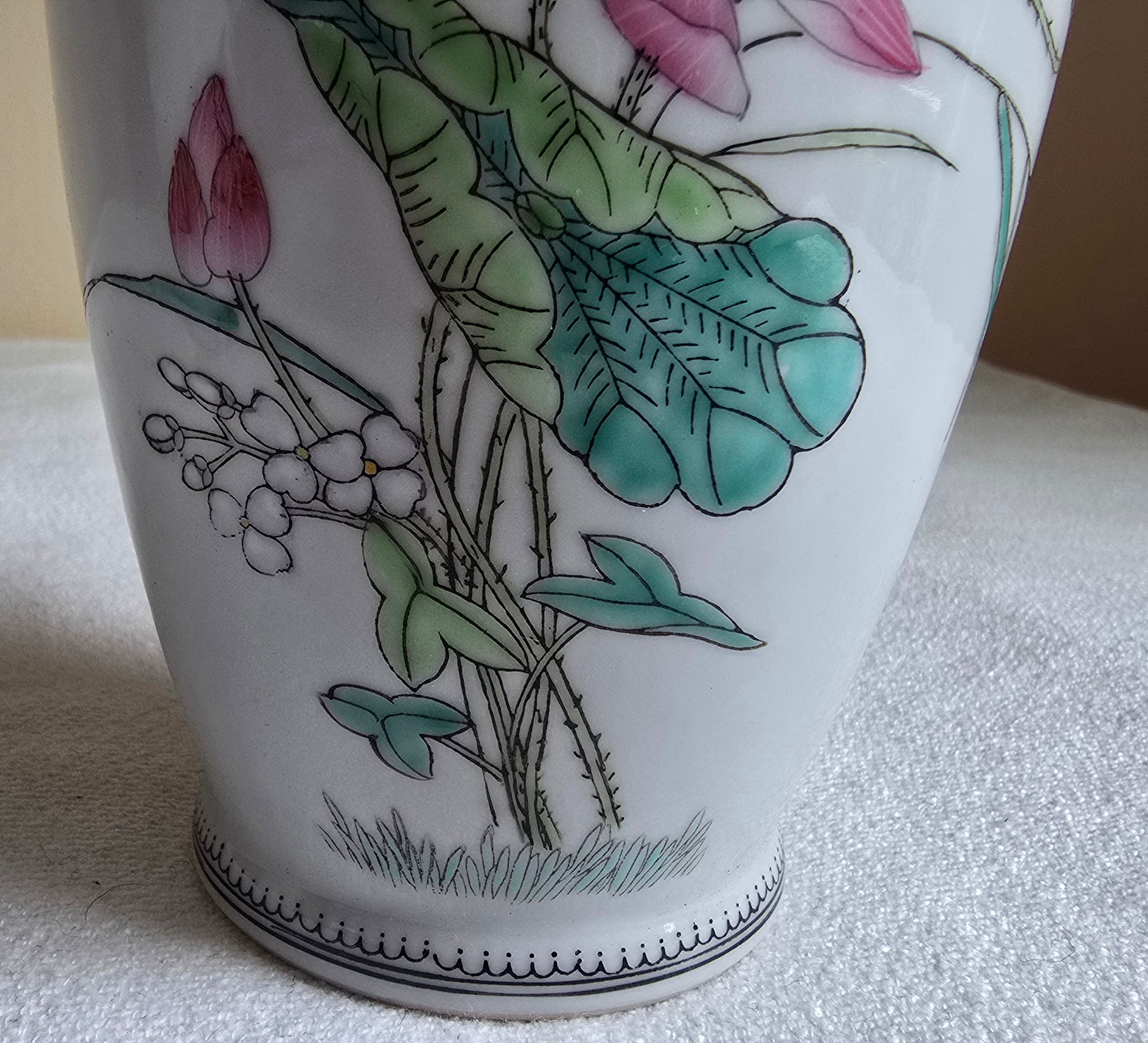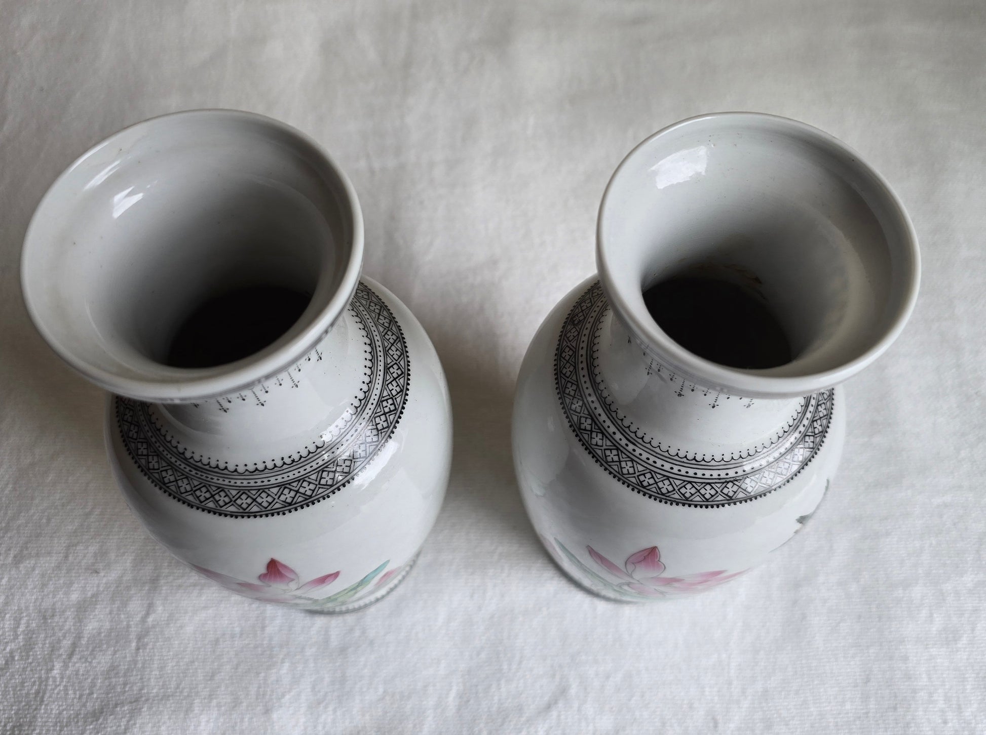 Vintage Asian Chinese Pair of Vases Lotus Flower & Bird Porcelain Hand Painted