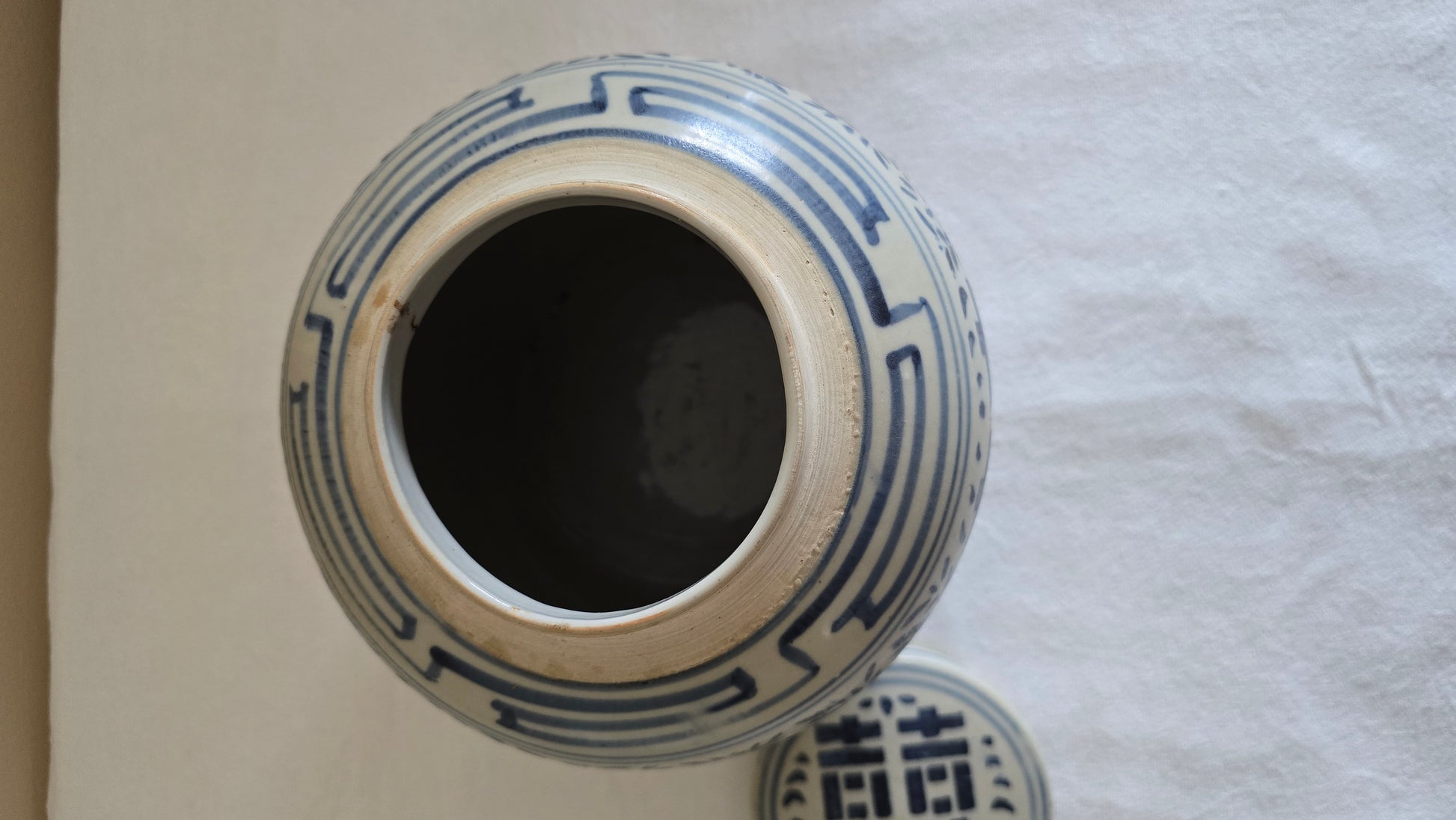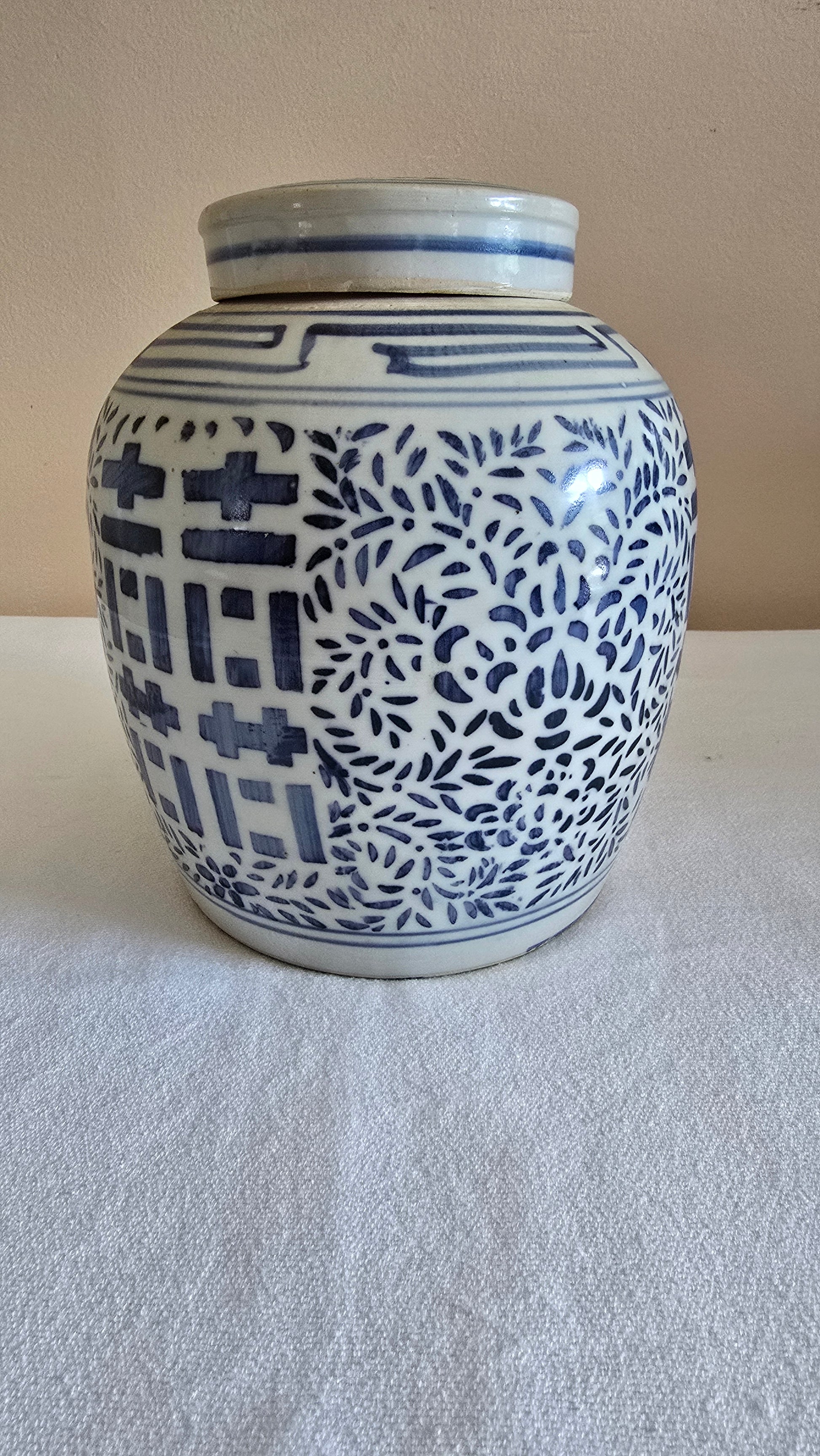 Vintage Blue & White Chinese Asian Double Happiness Ginger Jar with Lid