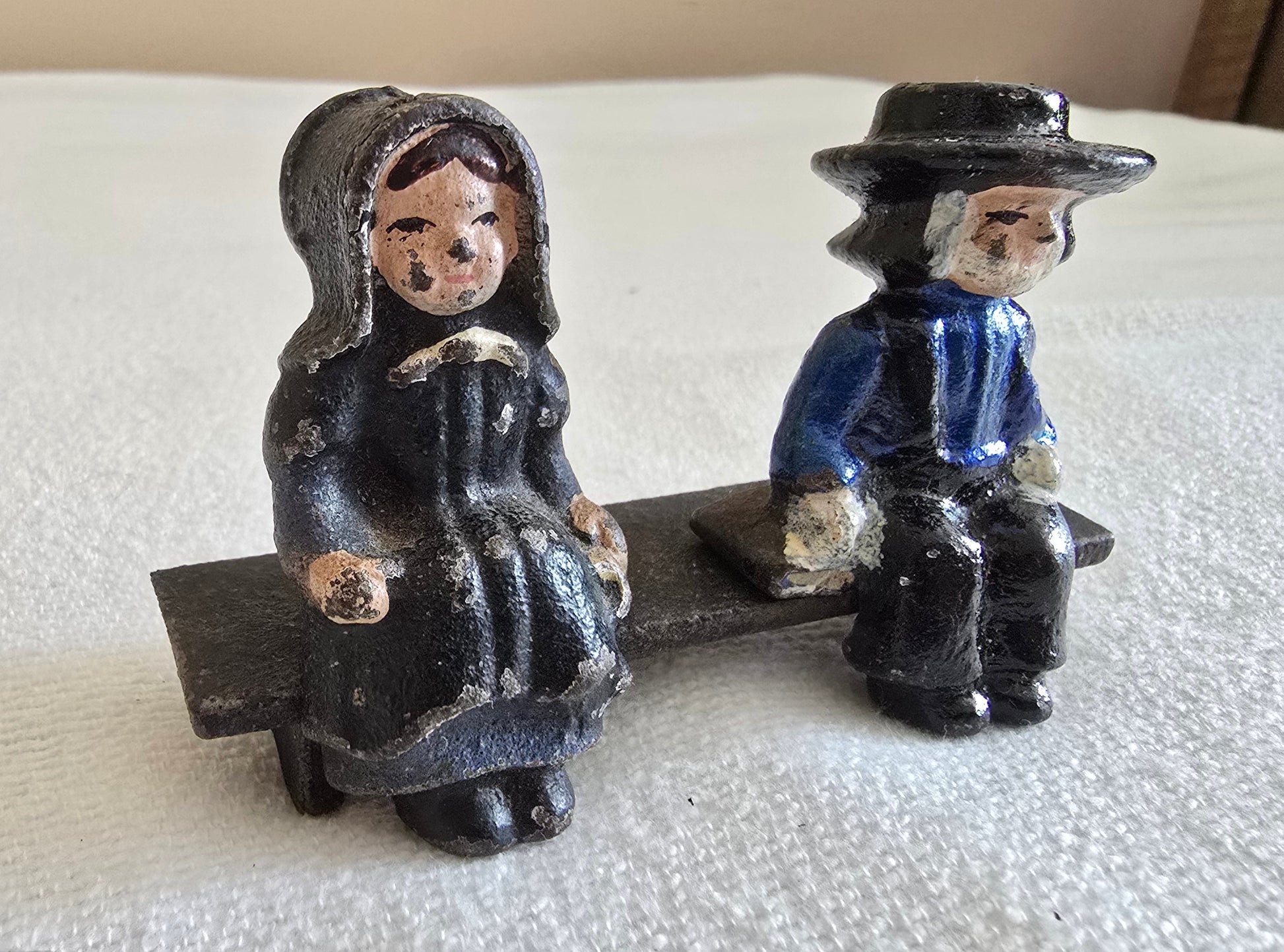 This vintage cast iron figurine features an Amish man and woman seated on a bench, measuring 3.5 inches wide, 1.25 inches deep, and 2.25 inches high. Crafted with attention to detail, it is in excellent condition with only minor signs of age and use, making it a distinguished collectible piece that reflects traditional Amish craftsmanship. Ideal for collectors or as a unique decorative accent, it offers both historical charm and enduring quality.