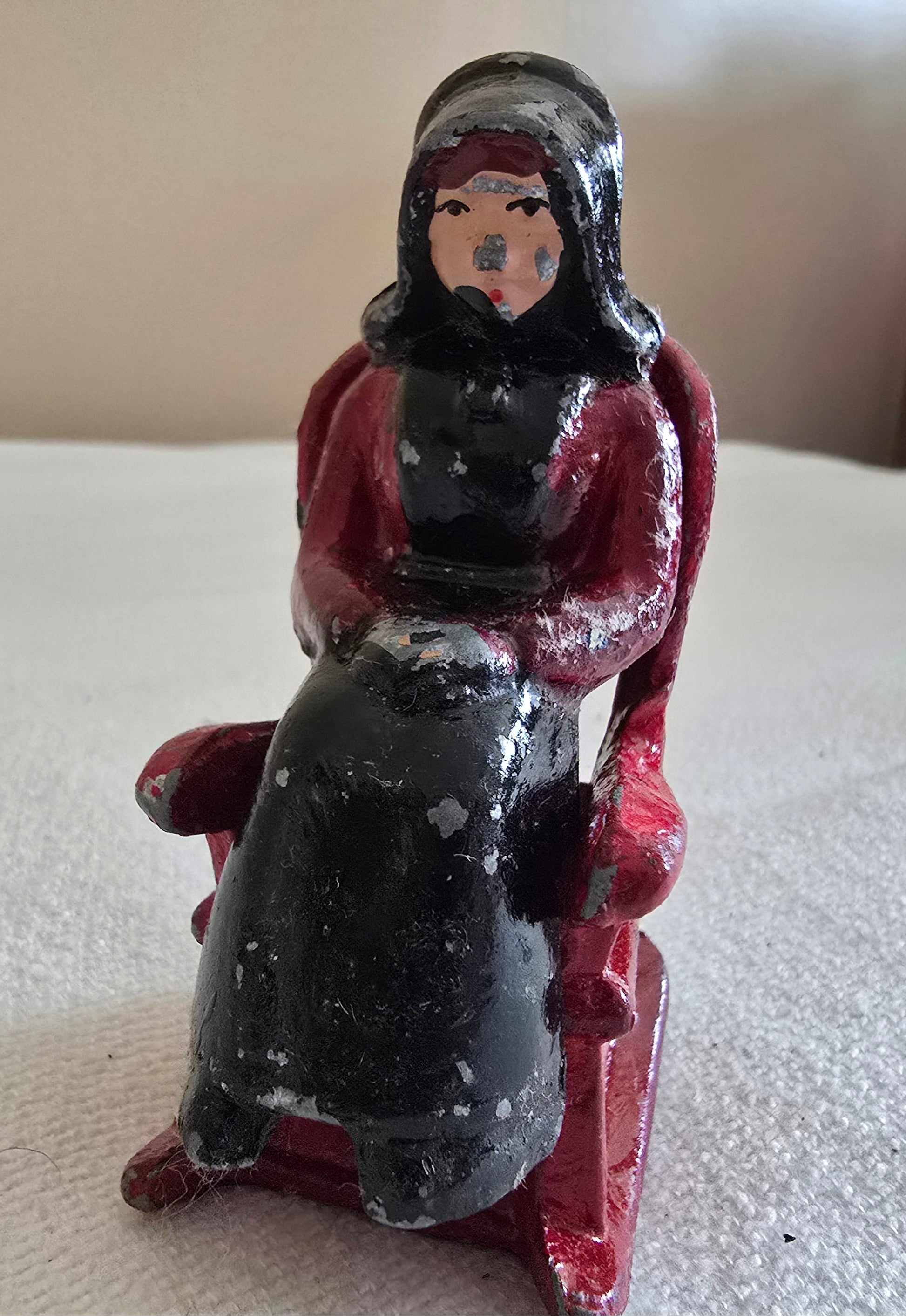These vintage cast iron salt and pepper shakers feature an Amish woman seated on a rocking chair, capturing a charming rustic aesthetic. Measuring 2" wide by 1.5" deep and 3.5" high, they show minor signs of age and use, adding to their authentic character. Ideal for collectors or those seeking a unique, functional piece with historical appeal.