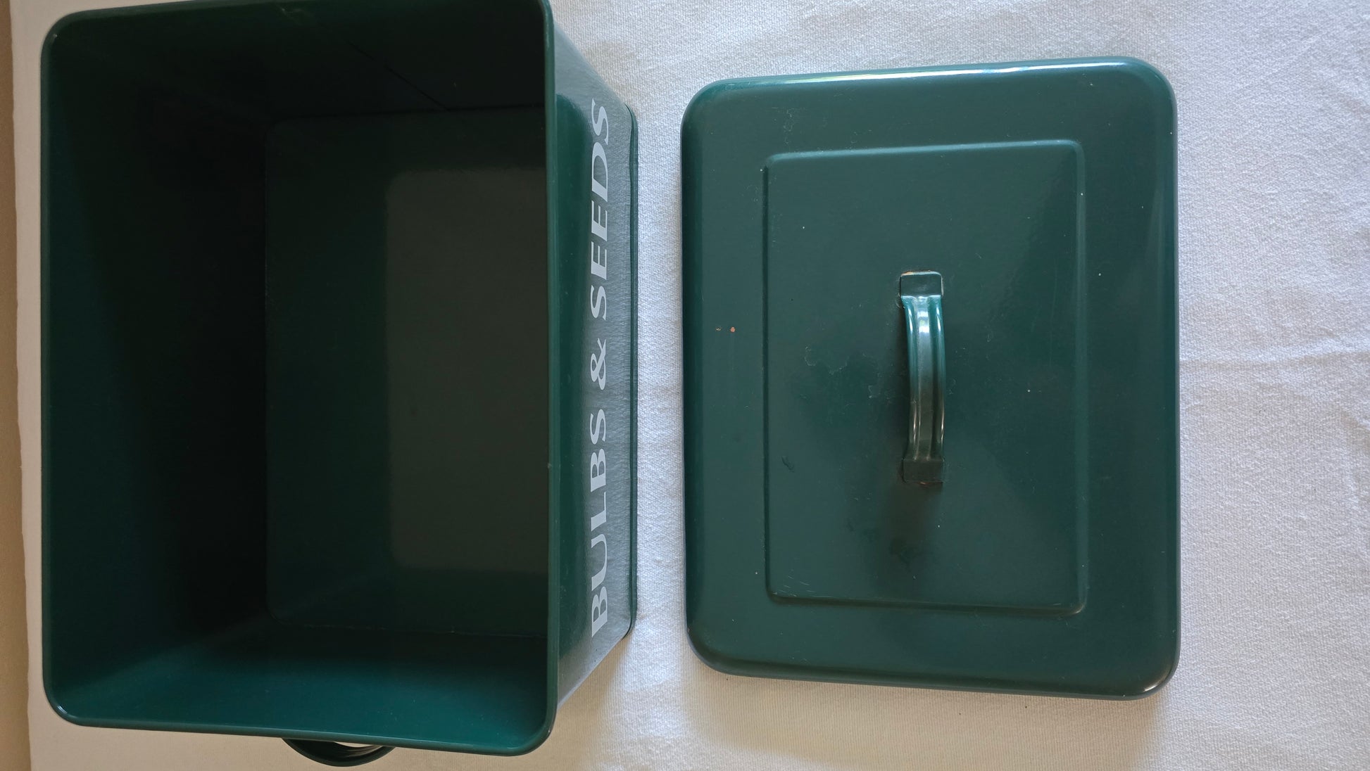 Vintage Green Metal Enamel Bulbs & Seeds Gardening Container Bin with Handles and Lid