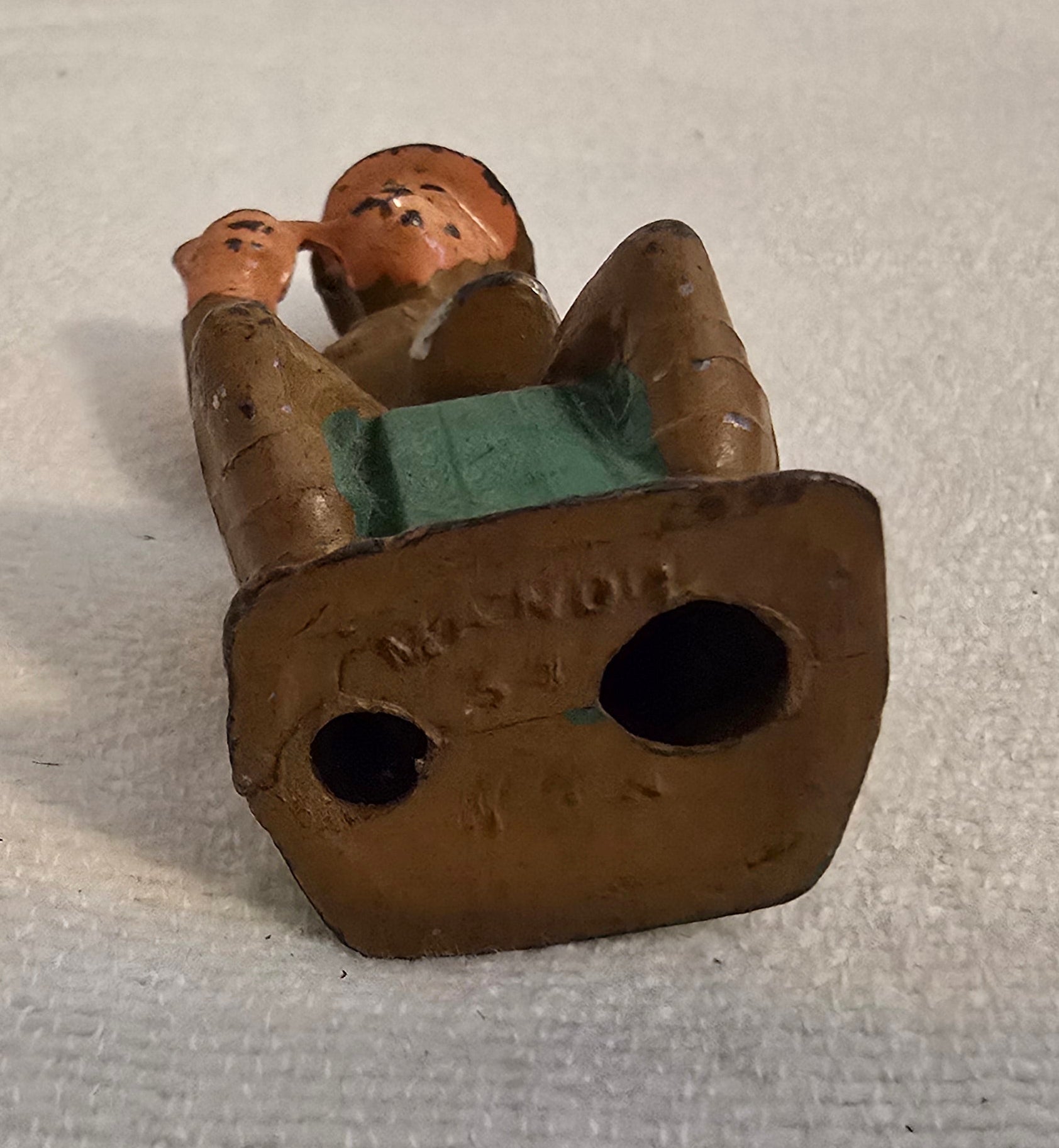 This vintage Manoil Barclay #54 lead toy soldier depicts a soldier eating, showcasing detailed craftsmanship characteristic of the era. Preserved in excellent condition, it bears only minor signs of age and use, making it a valuable collectible for enthusiasts of historic toy soldiers and lead figures. Its authentic design and quality materials reflect the legacy of Manoil Barclay’s production, offering both aesthetic appeal and historical significance. Measures 2.5" high.