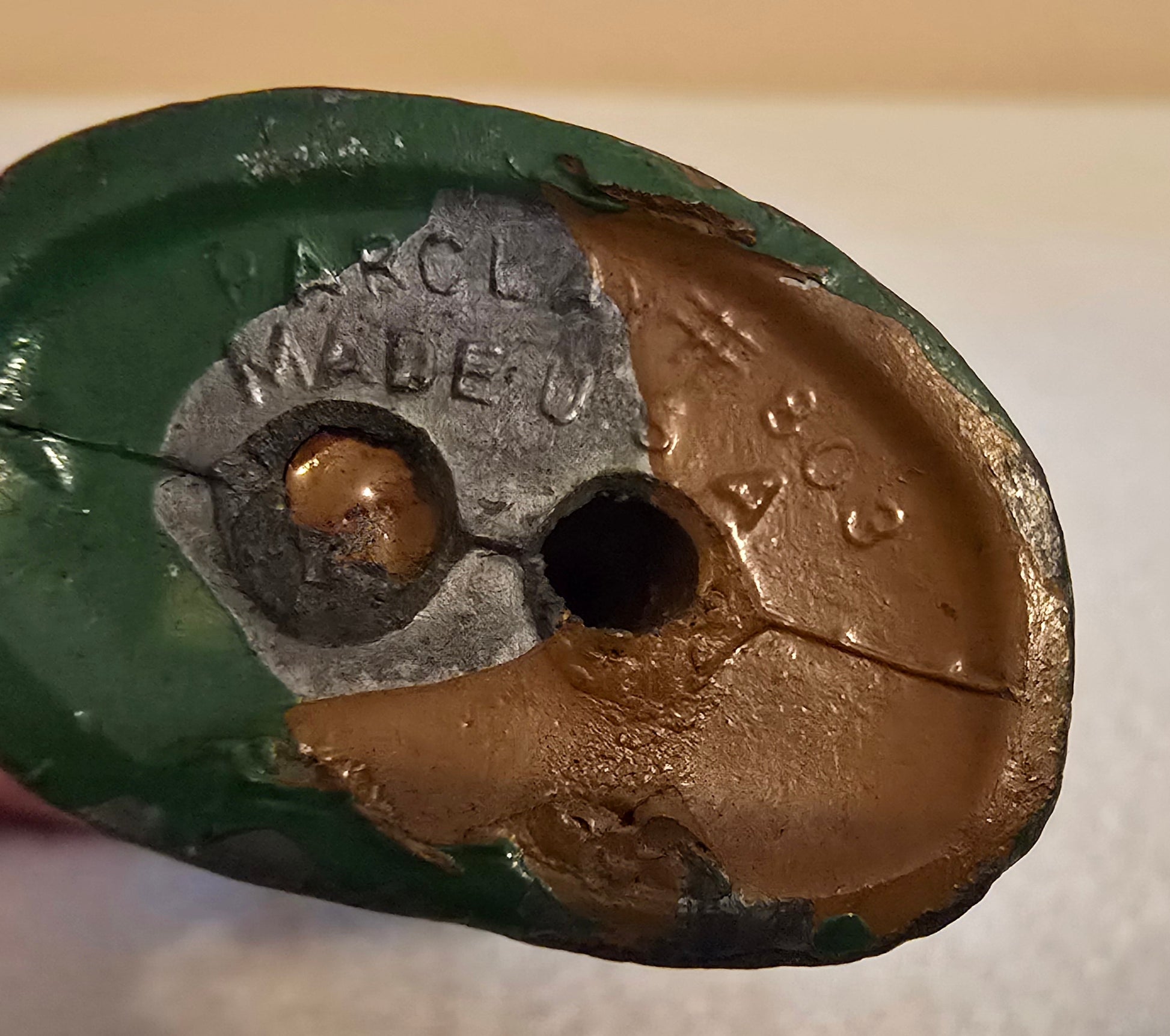 This vintage Manoil Barclay lead toy features a detailed Boy Scout figurine holding a flag, model #803. Preserved in excellent condition, it shows only minor signs of age and use, enhancing its authentic charm. A rare collectible, this piece may be missing an additional flag, adding to its unique history. Ideal for enthusiasts of vintage toys and scouting memorabilia.