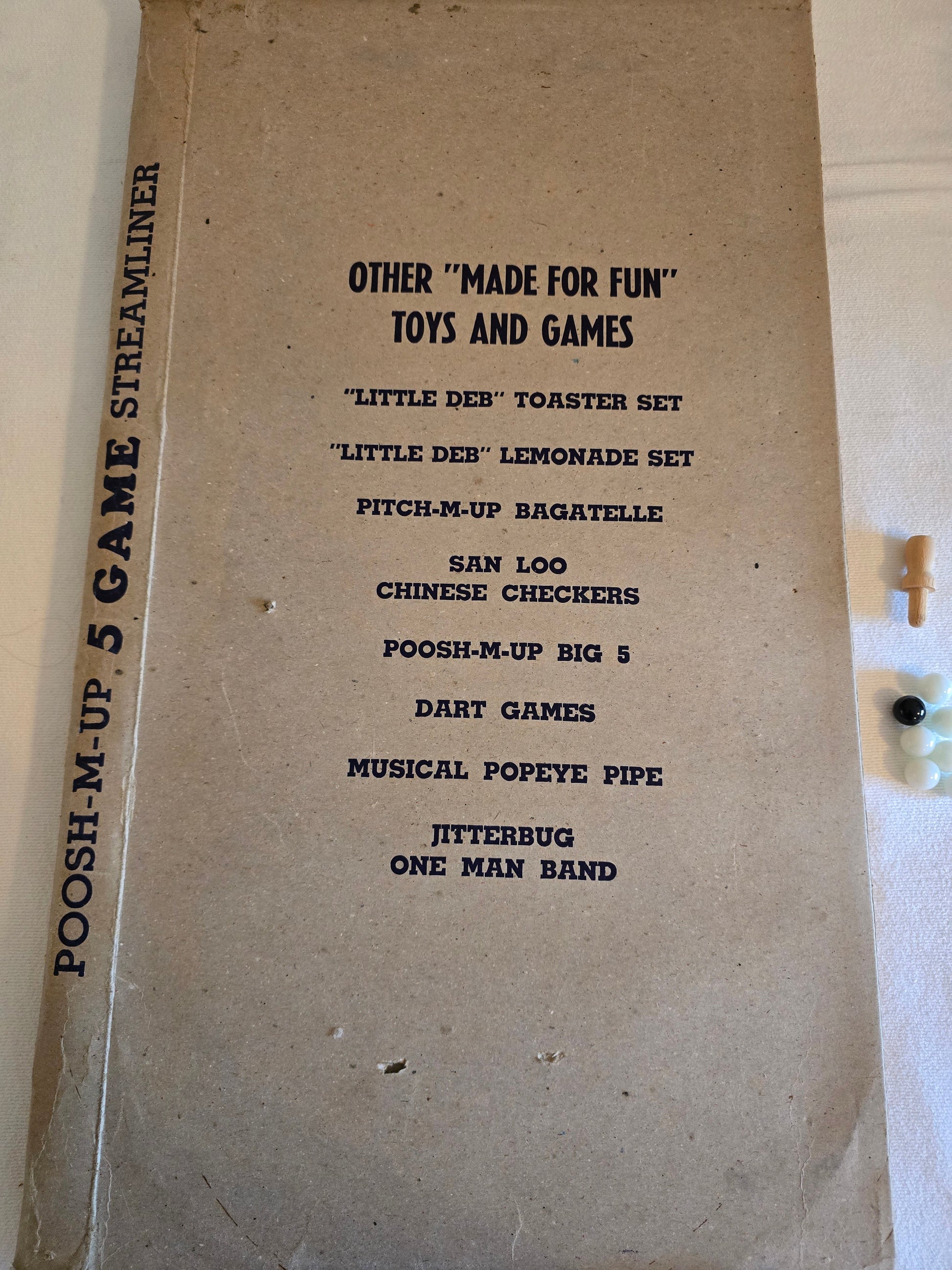 Discover the Vintage Poosh-M-Up 5 Game Streamliner No. 5GS by Northwestern Products Co., a classic American-made bagatelle tabletop pinball game. Measuring 22.5 x 12 inches, this collectible piece remains fully functional with only minor signs of age and use. It includes the original box, which shows significant wear and is flat, adding authentic vintage character. Perfect for enthusiasts and collectors seeking a nostalgic gaming experience with a well-preserved, historic design.