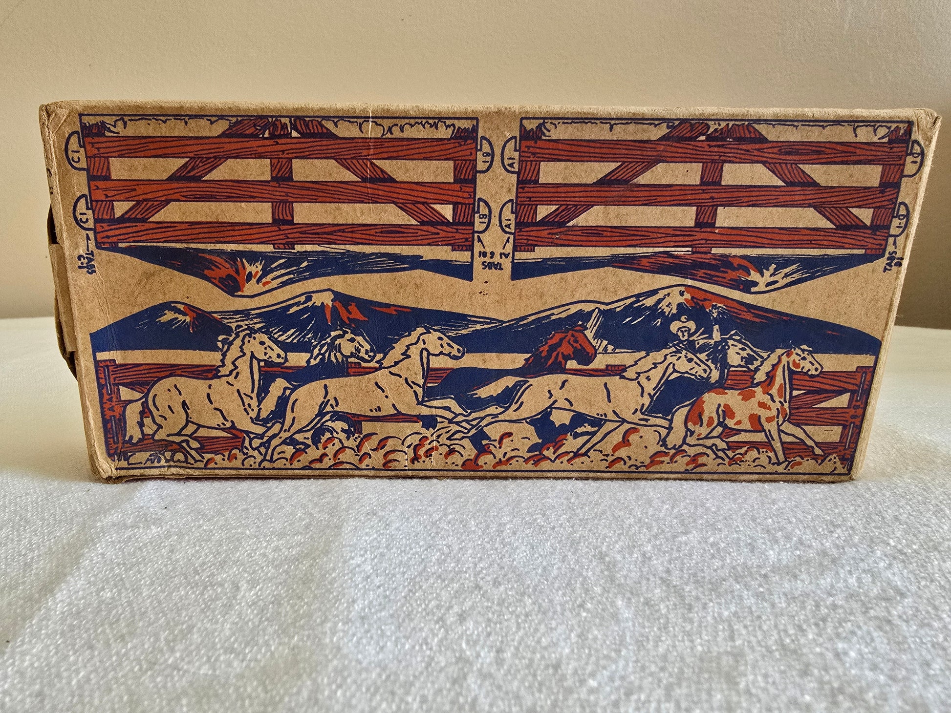 This vintage collection includes 100 plastic Cowboys and Indians toys, each measuring approximately 1" x 2". Housed in the original cardboard box, which features instructions for folding it into multiple display props, this set offers both play and presentation versatility. Maintained in excellent condition, these classic figures exemplify authentic vintage craftsmanship, making the set a prized addition for serious collectors and enthusiasts.