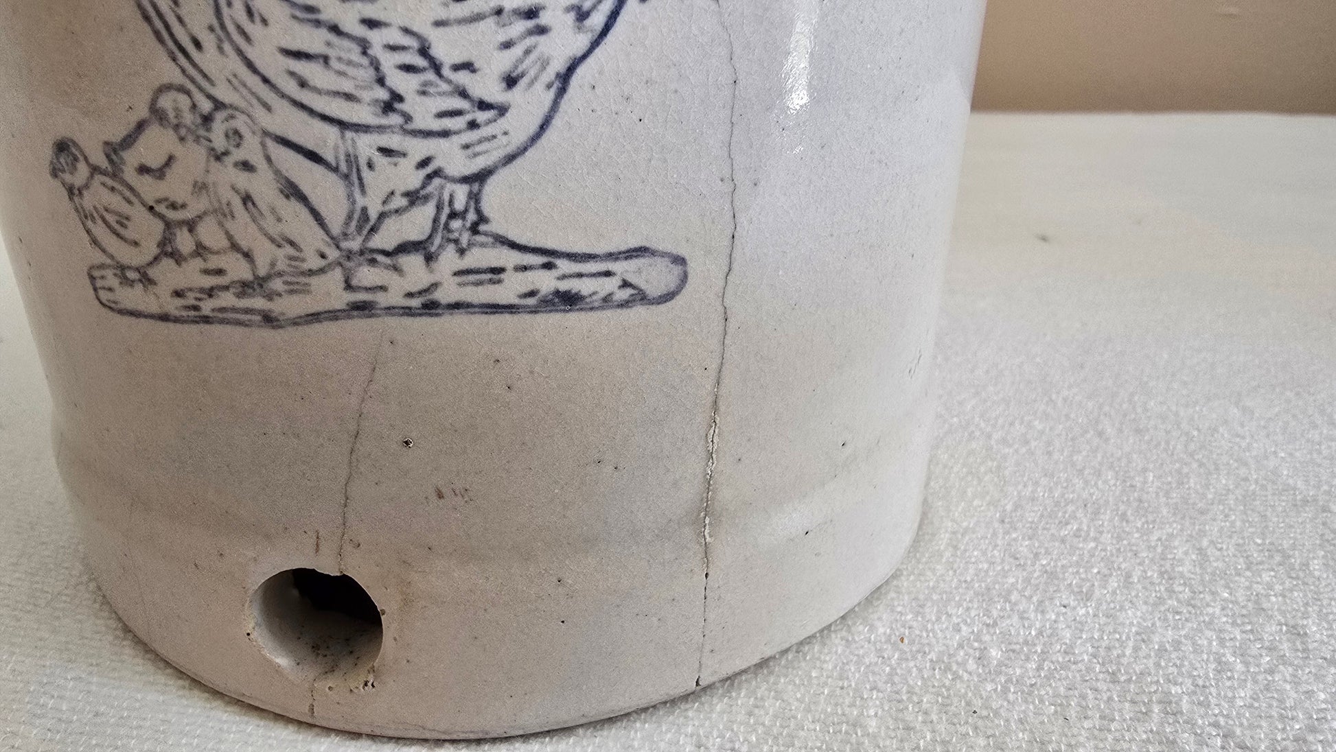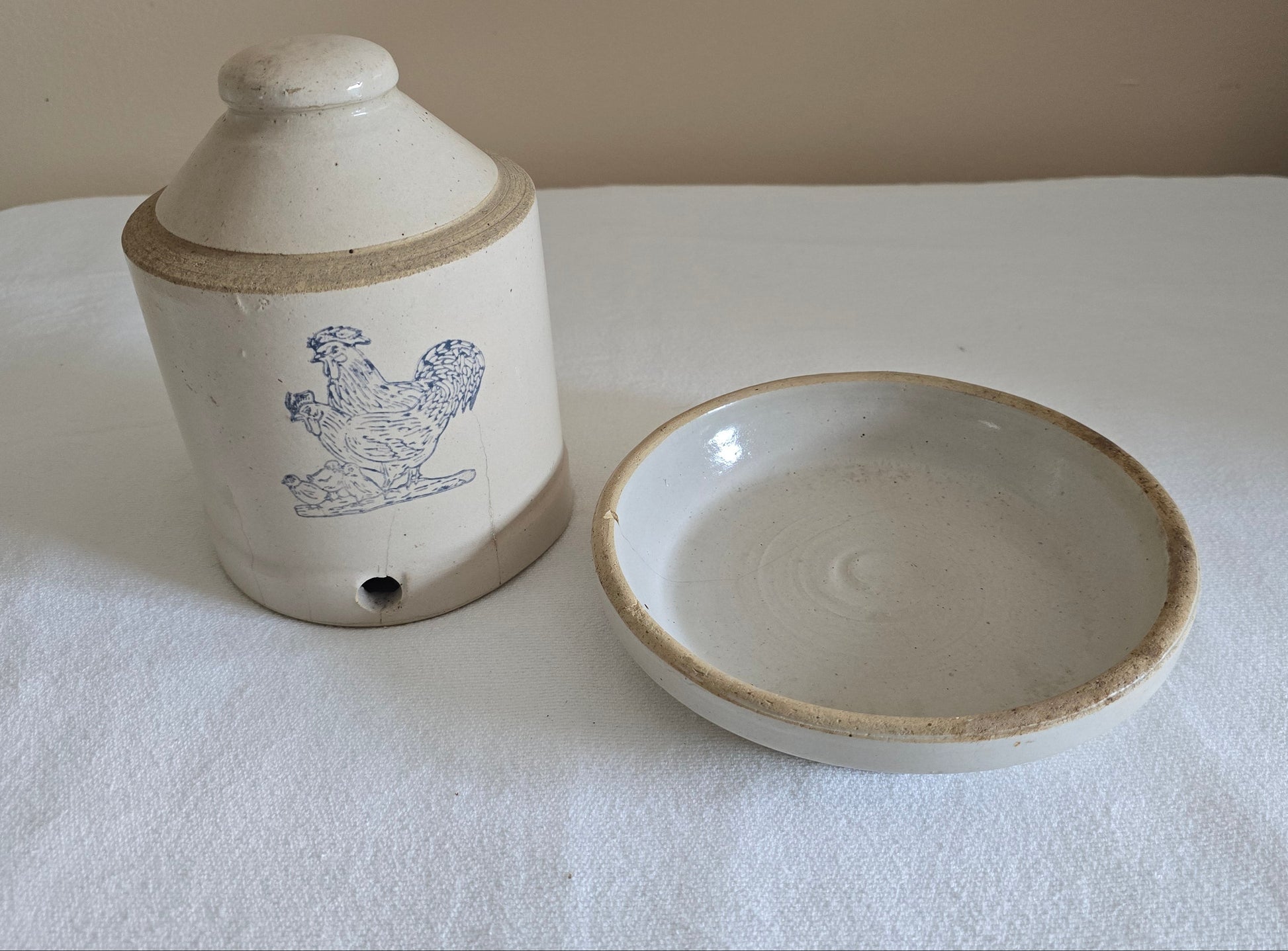 Vintage Stoneware Poultry Chicken Waterer Feeder Crock with Cobalt Blue Chickens with Dish